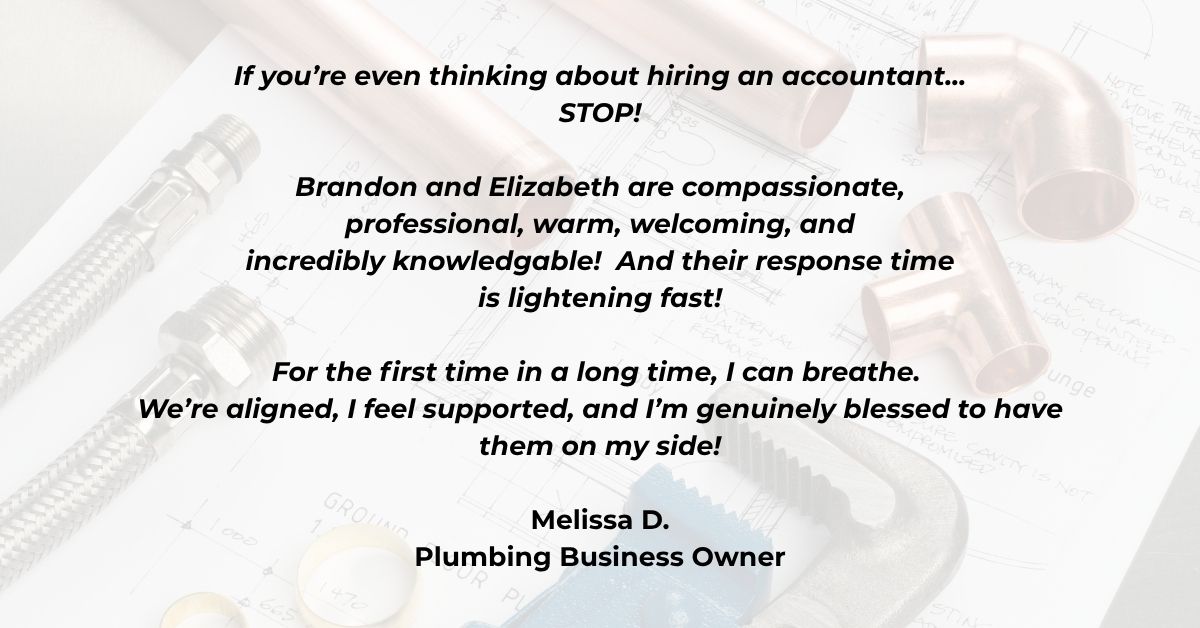 My husband runs his own business, and once we started to grow we knew we needed someone more experienced than our previous bookkeeper. Brandon and Elizabeth are phenomenal. So easy to work with, great communication, and definitely knows their stuff.